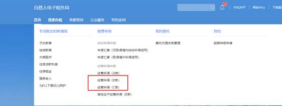 登录系统后,点击【我要办税】,选择【经营所得(B表)】或者【经营所得(C表)】(港澳居民存在多处经营所得来源时)。