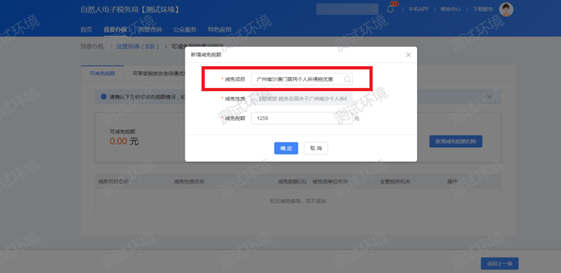 点击【新增减免税额扣除】,选择减免性质为【广州南沙香港/澳门居民个人所得税优惠】,并填写港澳居民优惠减免测算工具计算出的减免税额(仅供参考,允许修改)。