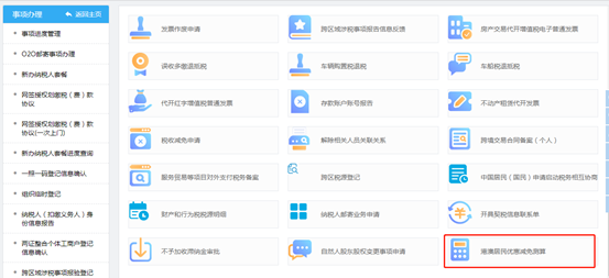 登录广东省电子税务局(etax.guangdong.chinatax.gov.cn/),选择自然人业务,输入账号密码登陆。点击 “我要办税”——“事项办理”——“港澳居民优惠减免测算”模块,根据您“香港居民”或“澳门居民”身份选择要测算的减免类型。