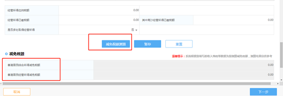 点击“减免税额测算”按钮进行测算,系统将展示“港澳居民综合所得减免税额”、“港澳居民经营所得减免税额”,测算结果仅供参考。
