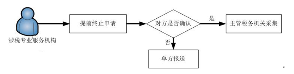2.在约定期限内提前终止协议的,应当向主管税务机关报送该表。双方未能达成终止协议的,税务机关将根据单方报送的《涉税专业服务协议要素信息采集表》,暂不受理涉税专业服务机构为该纳税人代为办理的税务事项,有关争议由双方自行协商或通过法律途径解决。