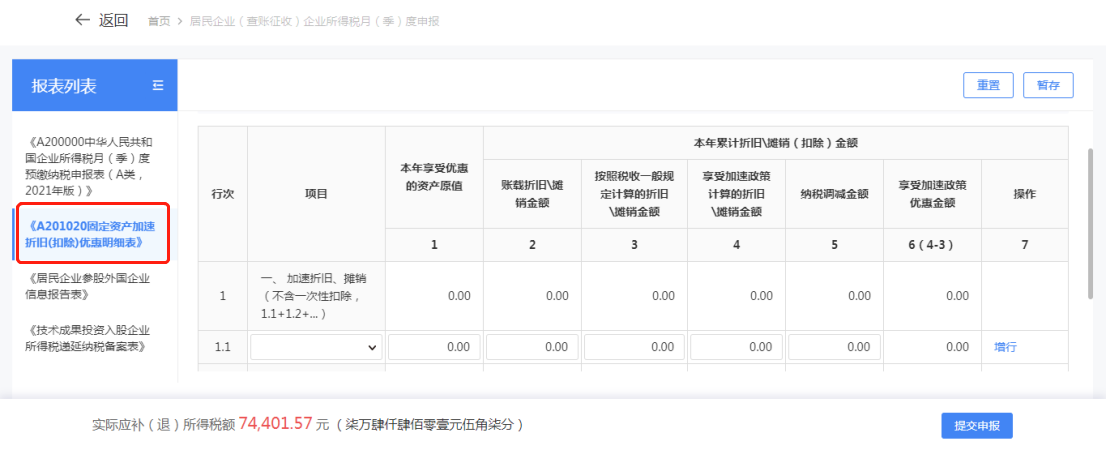 若纳税人需填报其他表单,如《资产加速折旧、摊销(扣除)优惠明细表》,则点击左侧报表列表进行切换。