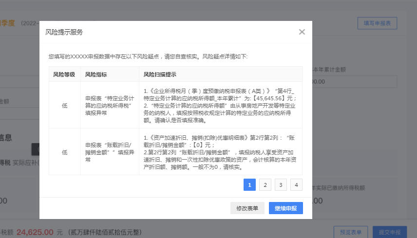 选择【风险提示服务】,系统会自动进行数据风险扫描,若存在风险疑点,纳税人可根据系统提示点击【修改表单】对数据进行修改,也可点击【继续申报】。申报成功后,点击【立即缴款】进行税款缴纳,完成本次申报涉及的税费款缴纳。