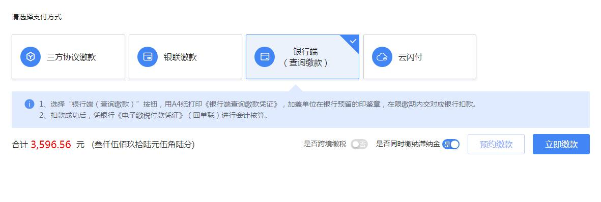 适用于已开设银行账户但未签订三方协议的纳税人。使用该缴款方式缴纳税费总共分为三步:打印银行端查询缴款凭证→加盖付款单位在银行预留的印鉴章→限缴期内到对应银行扣款。