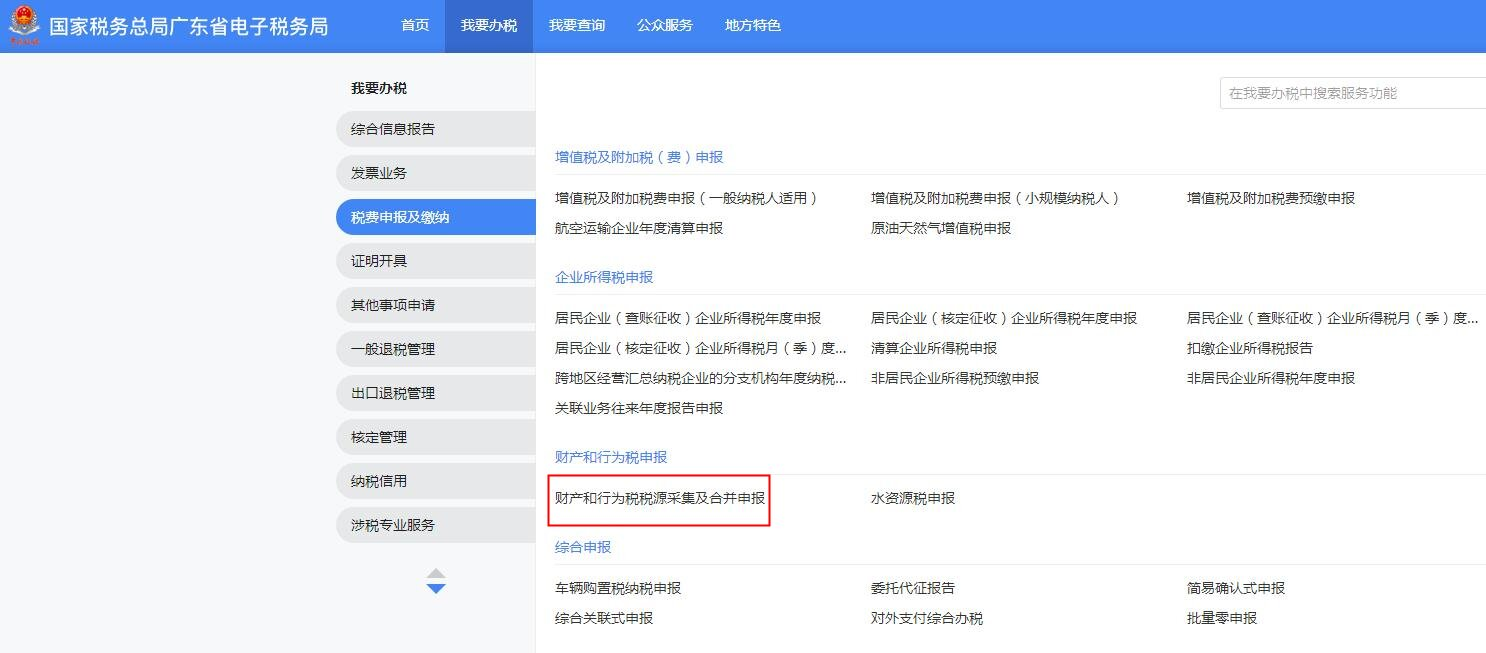 登录电子税局后,点击【我要办税】-【税费申报及缴纳】-【财产和行为税申报】-【财产和行为税税源采集及合并申报】功能菜单。