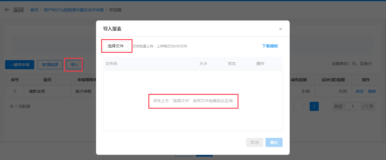 《印花税税源信息采集表》填写完成后,点击【导入】-【选择文件】或直接拖拽文件至指定区域。若导入文件选择错误,直接点击【删除】后重新导入文件,确认无误后,点击【确定】导入文件。