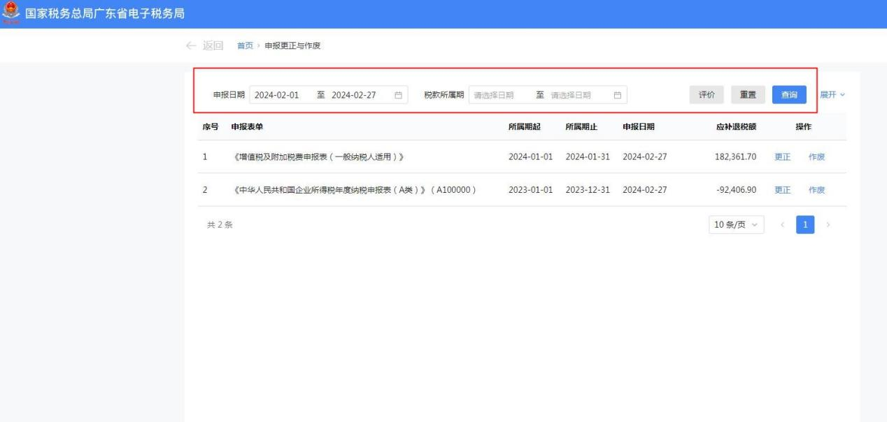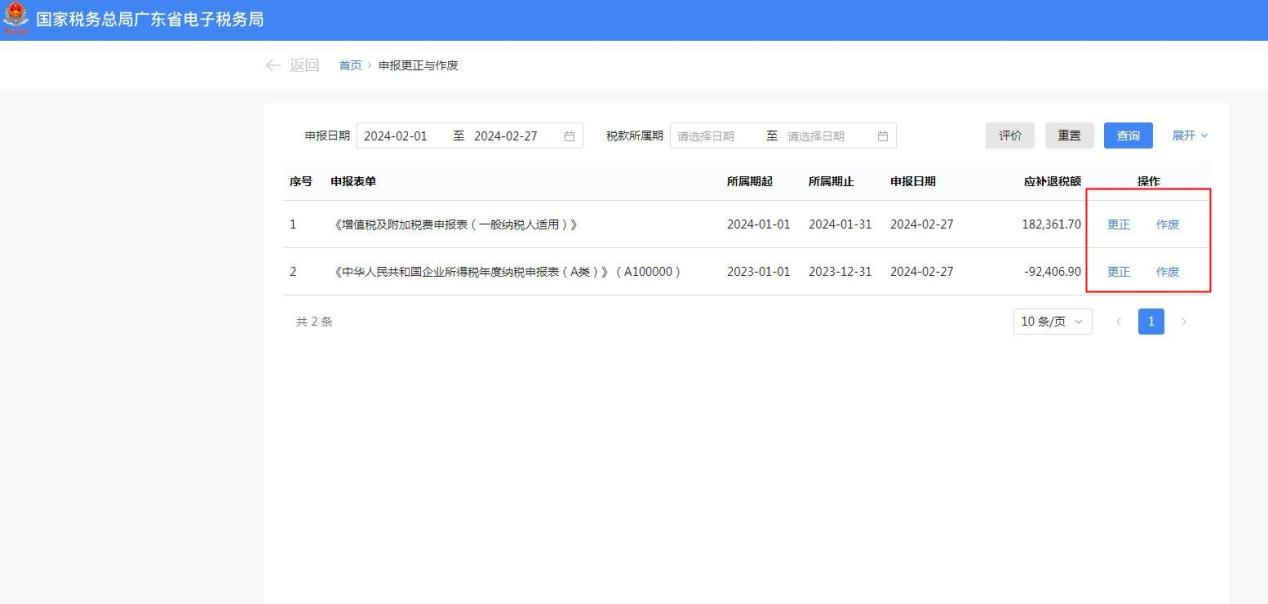 纳税人从查询结果列表中,通过“操作”列提供【更正】、【作废】完成对应申报表单的相关操作。