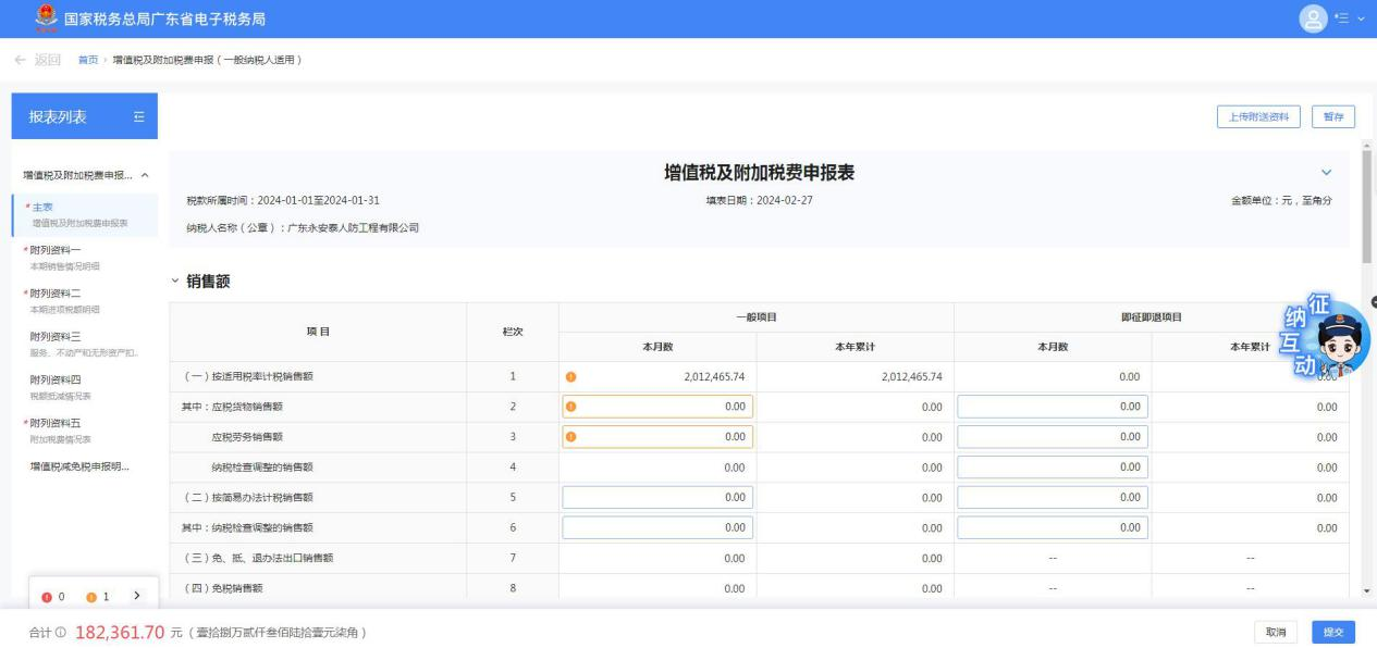 纳税人将直接进入申报表表单填写内容页面,完成附表及减免明细表填写,确认主表数据无误后,即可点击【提交】完成申报。