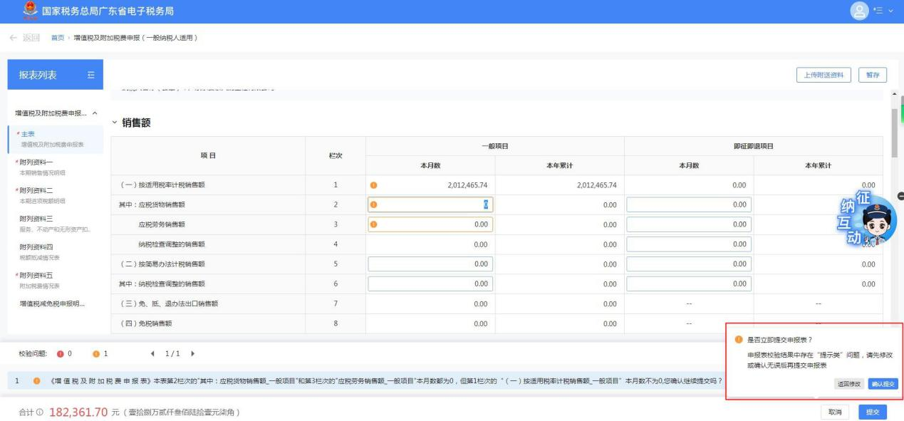 确认无误后,点击【提交】,若系统出现"是否立即提交申报表"提示(如下图),纳税人可点击【确认提交】直接进行申报;也可以点击【取消】,根据左下角(橙色)提示对表单内容进行修改。