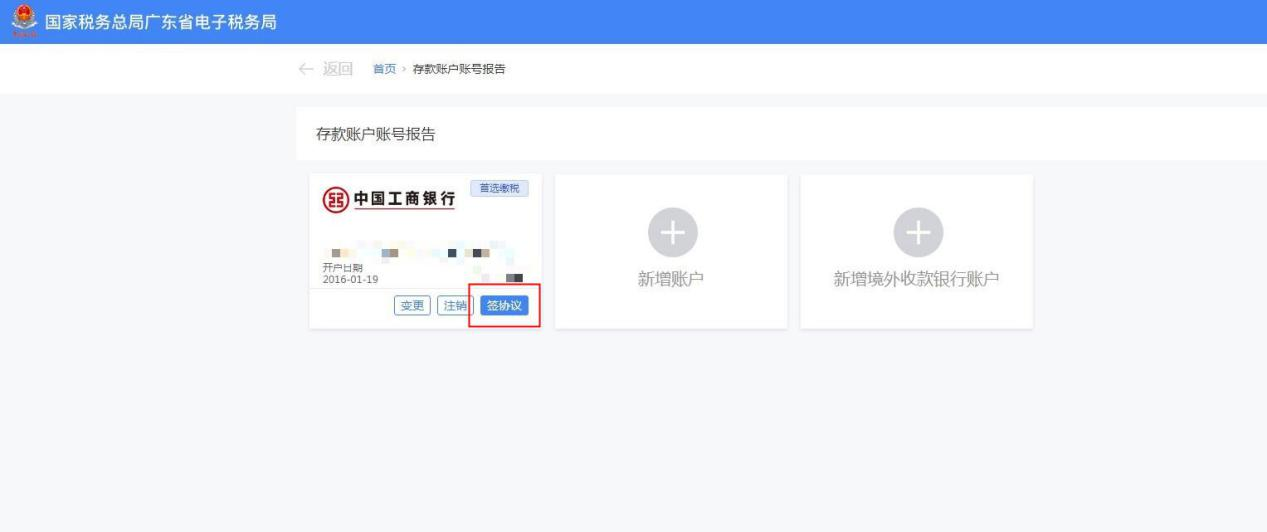 完成存款账户账号报告后,纳税人需要适用电子缴税系统缴纳税费、滞纳金和罚款的,可点击【签协议】跳转至三方协议签订界面,进行三方协议签订操作。