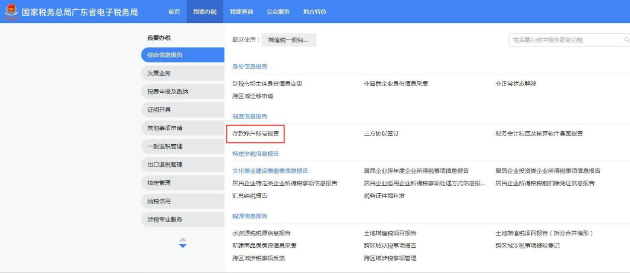 1.【我要办税】-【综合信息报告】-【制度信息报告】-【存款账户账号报告】。