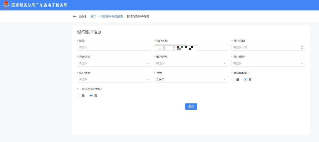 点击【新增账户】,跳转新增账户界面。填写银行账户相关信息,点击提交并确认,填写时需注意“首选缴税账户”和“一般退税账户”标识的选择。