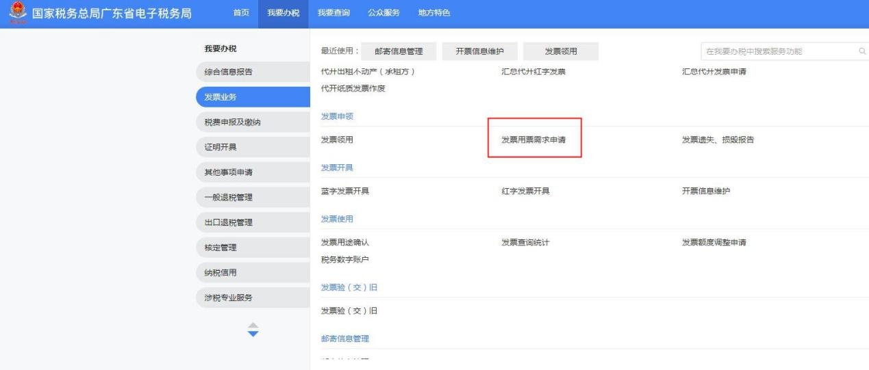1.【我要办税】-【发票业务】-【发票申领】-【发票用票需求申请】。