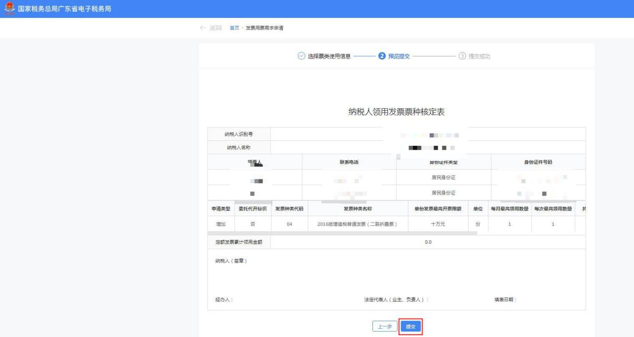 点击【下一步】进入预览提交页面,确认所填数据无误后点击【提交】,完成发票票种核定申请。