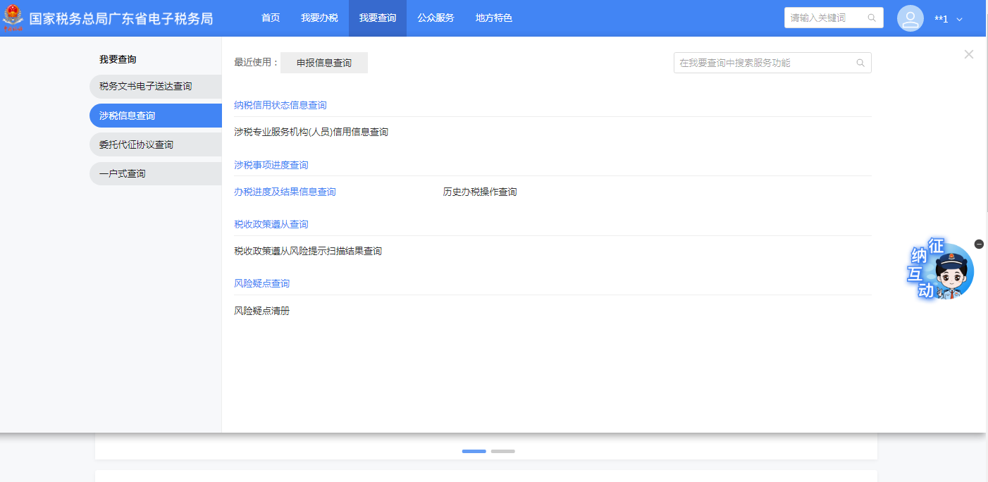 查询路径一:登录后首页底端-【涉税查询】-【办税进度及结果信息查询】