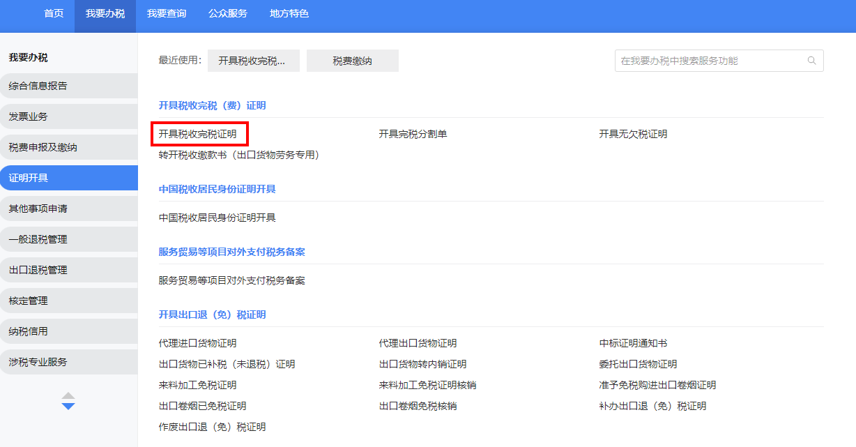 登录新电子税局后,点击【我要办税】-【证明开具】-【开具税收完税证明】功能菜单。