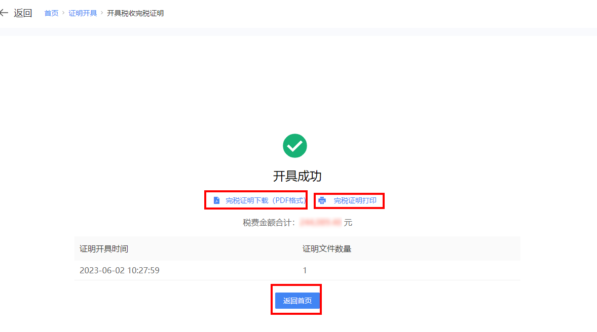 开具成功后,可点击【完税证明下载(PDF格式)】,下载税收完税证明;也可点击【完税证明打印】,打印税收完税证明。