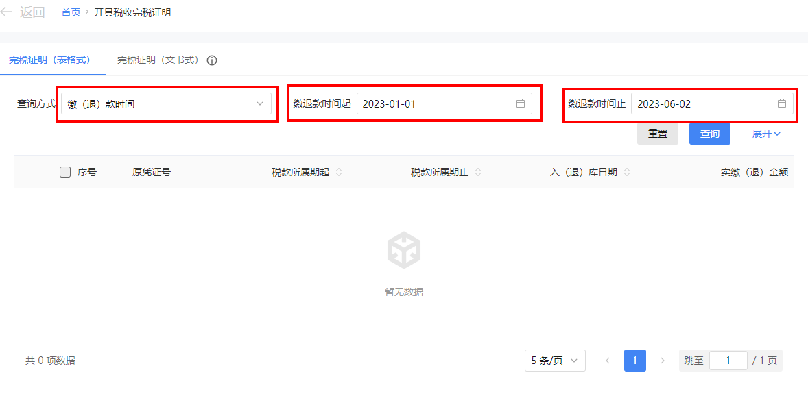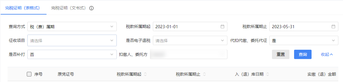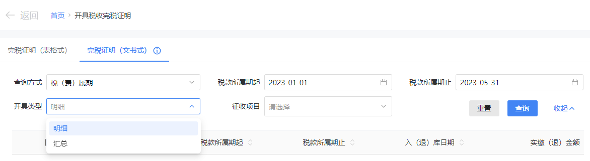 选择查询方式为税(费)属期或缴(退)款时间。选择查询日期起和查询日期止(或税款所属期起止)。可点击【展开】,选择开具类型为明细或汇总。