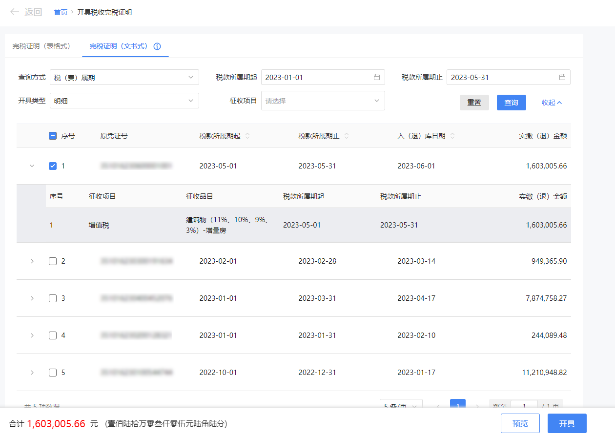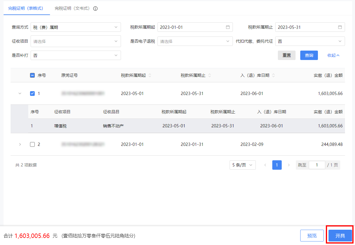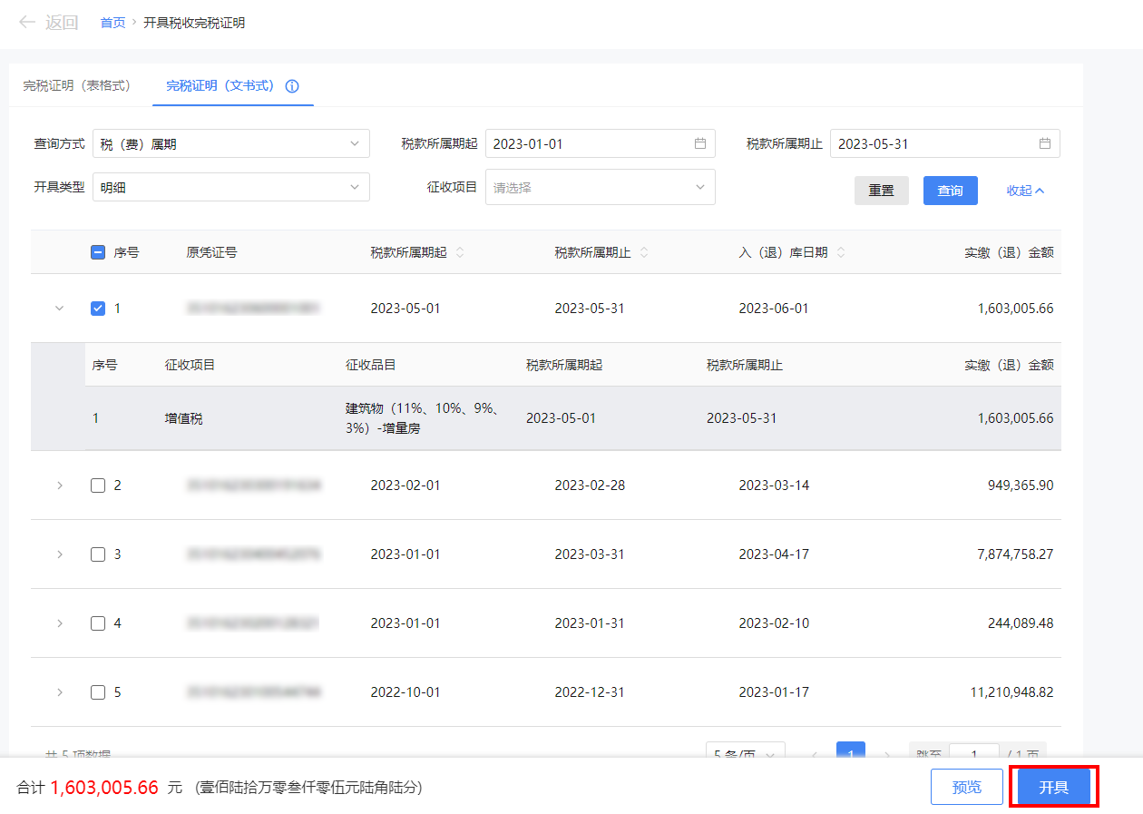 点击【查询】,显示可开具完税证明的凭证信息,勾选需要开具完税证明的凭证信息。