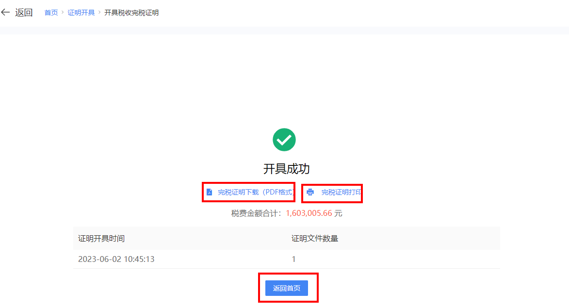 开具成功后,纳税人点击【完税证明下载(PDF格式)】,下载税收完税证明;及点击【完税证明打印】,打印税收完税证明。