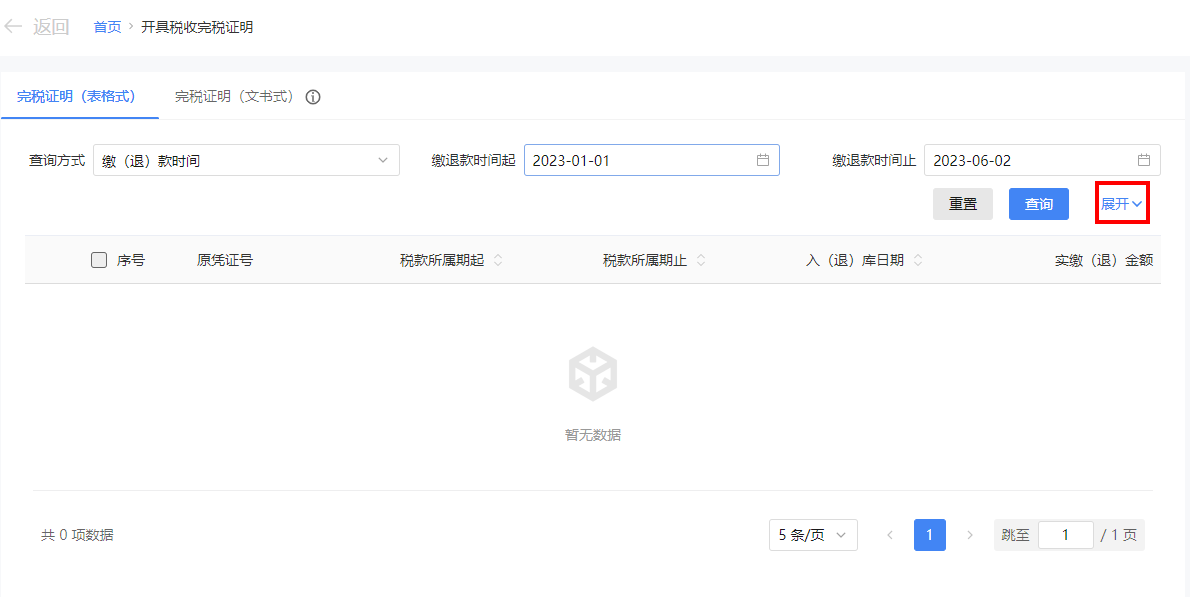 点击【展开】展示更多查询条件,纳税人可根据实际情况选择条件进行查询。