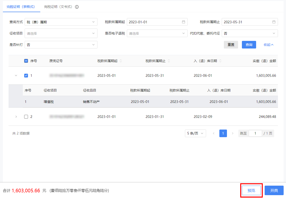纳税人可以选择直接开具或预览税收完税证明后开具。
