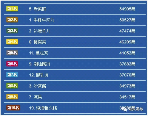 7月20日,“汕头手信(食品类)十大代表品类”正式产生。老菜脯、手捶牛肉丸、达濠鱼丸、橄榄菜、单丛茶、潮汕朥饼、腐乳饼、沙茶酱、凉果、澄海猪头粽荣登“汕头手信(食品类)十大代表品类”宝座。