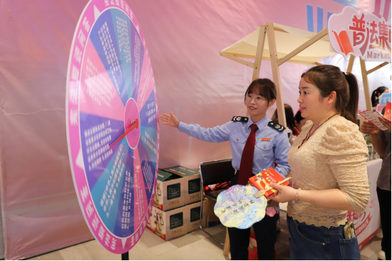 在宪法知识普及区,“宪法知识问答转盘”和“法治盲盒拆拆拆”互动游戏极大调动了旅客朋友们的参与热情。随着转盘的转动和盲盒的开启,一道道与生活息息相关的法律知识题目引发参与者的思考。工作人员为旅客们读题并进行提示,现场答题声与欢呼声交织,法治意识在潜移默化中深入人心。