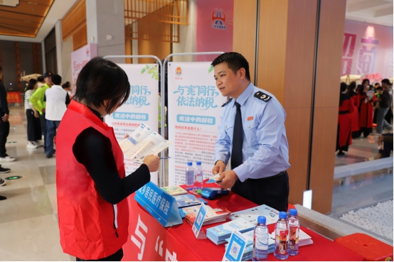近日,在潮惠高速陆河服务区内,一场以“与‘宪’同行 依法纳税”为主题的宪法宣传周活动正热烈开展。税务人员与普法志愿者们用热情的笑容迎接每一位途经的旅客,将宪法精神和税法知识通过生动有趣的形式传递出去。