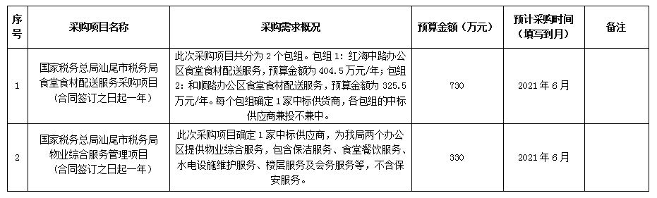 为便于供应商及时了解采购信息,根据《财政部关于开展政府采购意向公开工作的通知》(财库〔2020〕10号)等有关规定,现将国家税务总局汕尾市税务局2021年5至6月采购意向公开如下: