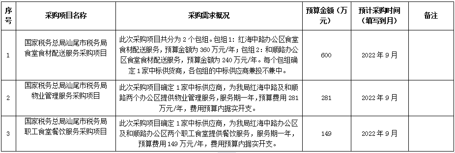 为便于供应商及时了解采购信息,根据《财政部关于开展政府采购意向公开工作的通知》(财库〔2020〕10号)等有关规定,现将国家税务总局汕尾市税务局2022年9至10月政府采购意向公开如下: