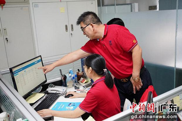 图为赵宝琳在公司财务部了解办税员如何通过电子税务局办理出口退(免)税。