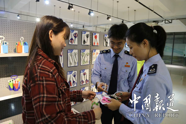 中锐工贸有限公司财务人员向税务部门人员介绍出口产品。(通讯员供图)