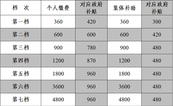 集体经济组织可根据经济能力,选择其中一档对参保人缴费给予补助,无经济能力的可以不对参保人缴费给予补助。具体由集体经济组织与参保人协商,并经村民大会或村民代表大会确定。无集体经济组织或集体经济组织未给予补助的参保人,可以参照集体经济补助标准缴纳集体经济组织的补助费用,同样享受政府对集体经济组织补助对应的补贴。政府补贴累计不超过每人21600元。