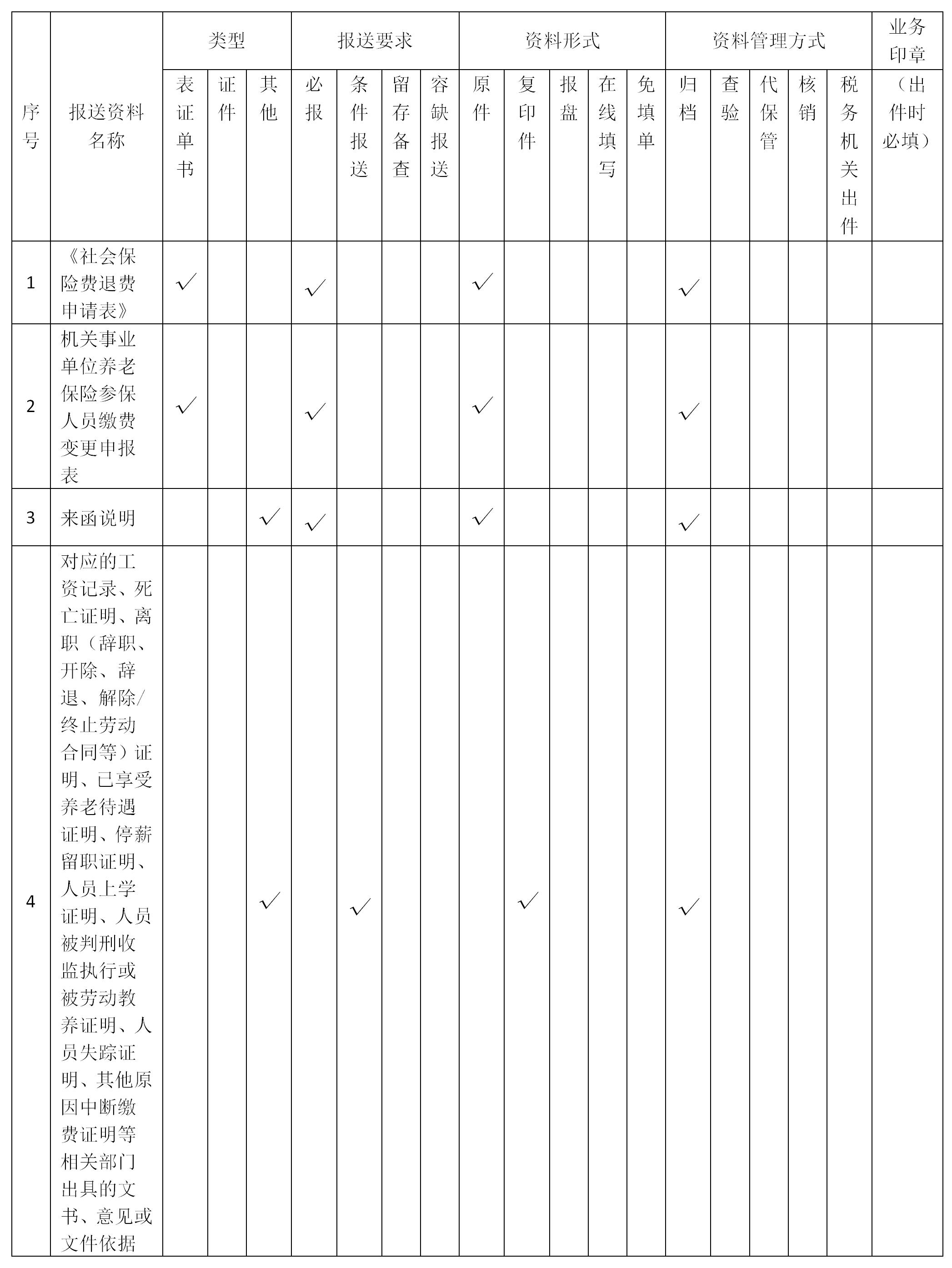 对应的工资记录、死亡证明、离职(辞职、开除、辞退、解除/终止劳动合同等)证明、已享受养老待遇证明、停薪留职证明、人员上学证明、人员被判刑收监执行或被劳动教养证明、人员失踪证明、其他原因中断缴费证明等相关部门出具的文书、意见或文件依据的报送条件:多缴、误缴退费。