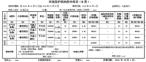 例4:某建筑施工单位2018年1月-3月从事建筑工程施工(建设楼盘),1-3月建筑面积为10000平方米,是环保税纳税人,施工过程中采取了定期喷洒抑制剂扬尘污染控制达标措施。2018年1月-3月大气污染物应纳税额是多少?