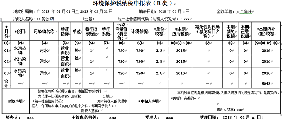 例2:某餐饮店营业面积为600㎡,是环保税纳税人,该餐饮店未安装排污计量设备和用水测量设备,无法核定污水排放量,2018年1月-3月水污染物应纳税额是多少?
