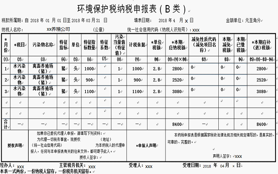 例1:某规模化养猪企业是环保税纳税人,2018年1月有猪存栏量1000头,2018年2月有猪存栏量900头,2018年3月有猪存栏量1100头。2018年1月-3月水污染物应纳税额是多少?