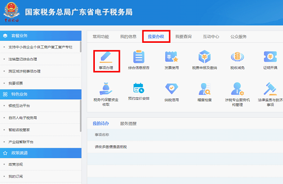 1.登录广东省电子税务局,点击【我要办税】--【事项办理】
