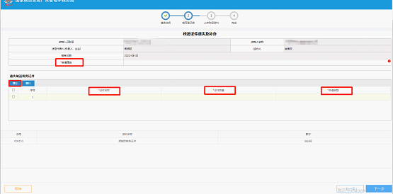 3.根据企业实际经营情况,填写“申请理由”,然后点击【新增】,填写“证件名称”、“证明数量”、“申请类型”,点击【下一步】