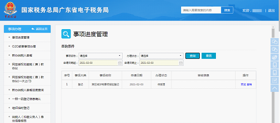 6.提交成功后,可在【事项办理—事项进度管理】模块查询报验地主管税务机关受理进度。