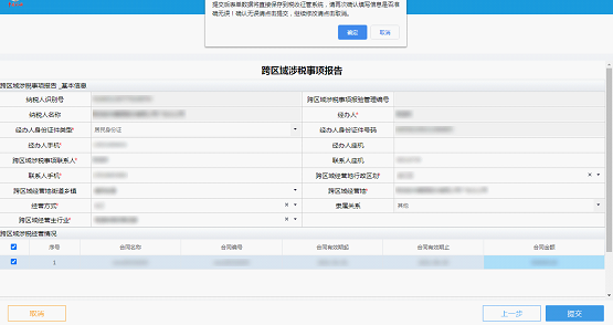 6.信息填写完成后,点击“提交”,弹出提示窗,提示纳税人再次检查填写信息是否准确。点击提示窗的“确定”或者“取消”可以关闭提示窗。