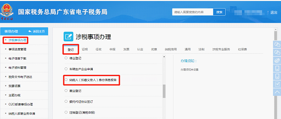 具体流程:(企业身份进入)我要办税>事项办理>涉税事项办理>登记>纳税人(扣缴义务人)身份信息报告