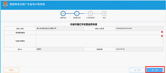 5.进入该模块后,填写信息资料,确认无误后,点击-【下一步】