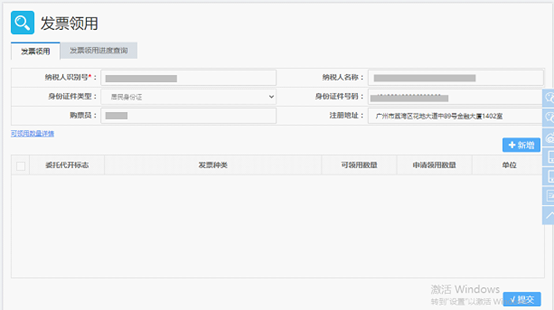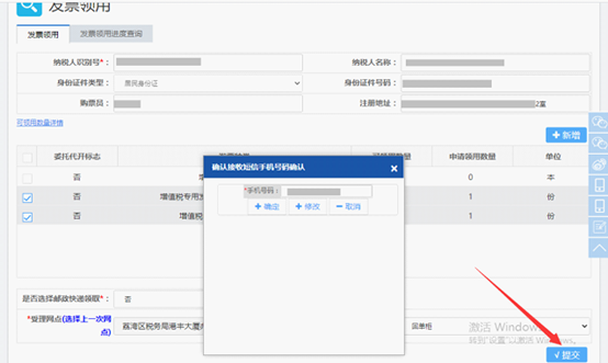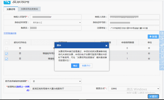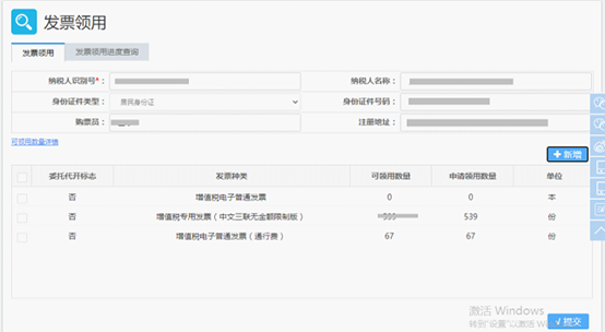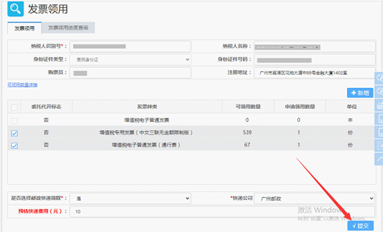 (5)勾选需要领购的发票,录入“申请领用数量”,选择领取方式,点击“提交” 。