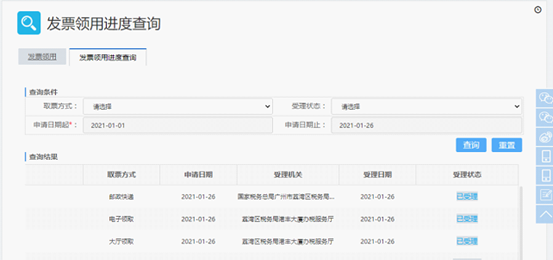 点击【发票领用进度查询】,可查询发票领用的申请记录及办理情况。