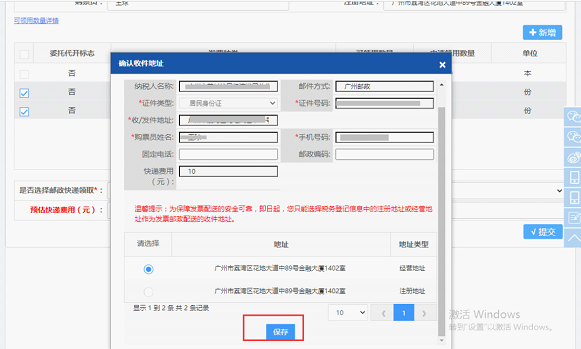 (6)①若选择的邮政领取,进入地址填写页面,点击“保存”。