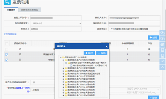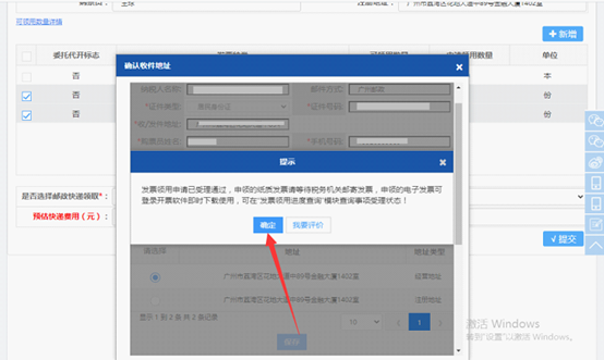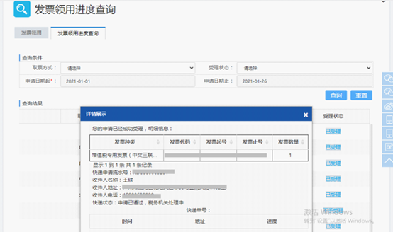 点击查询结果中的受理状态的链接可查看申请领用的发票数据以及其他信息(比如快递信息)。