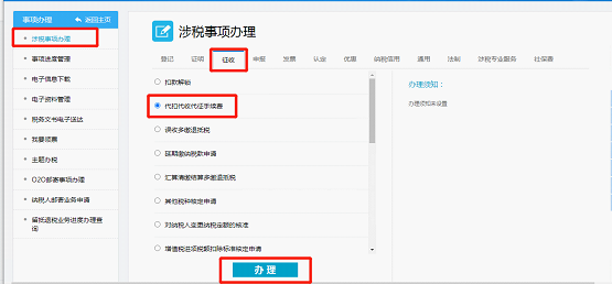 3.点击【涉税事项办理】,选择【征收】点击【代扣代收代征手续费】点击【办理】