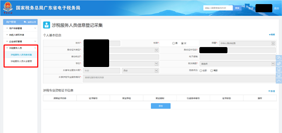 5.点击【涉税服务人员】-【涉税服务人员信息采集】,并按要求填写相关信息后,点击【确认】即可,